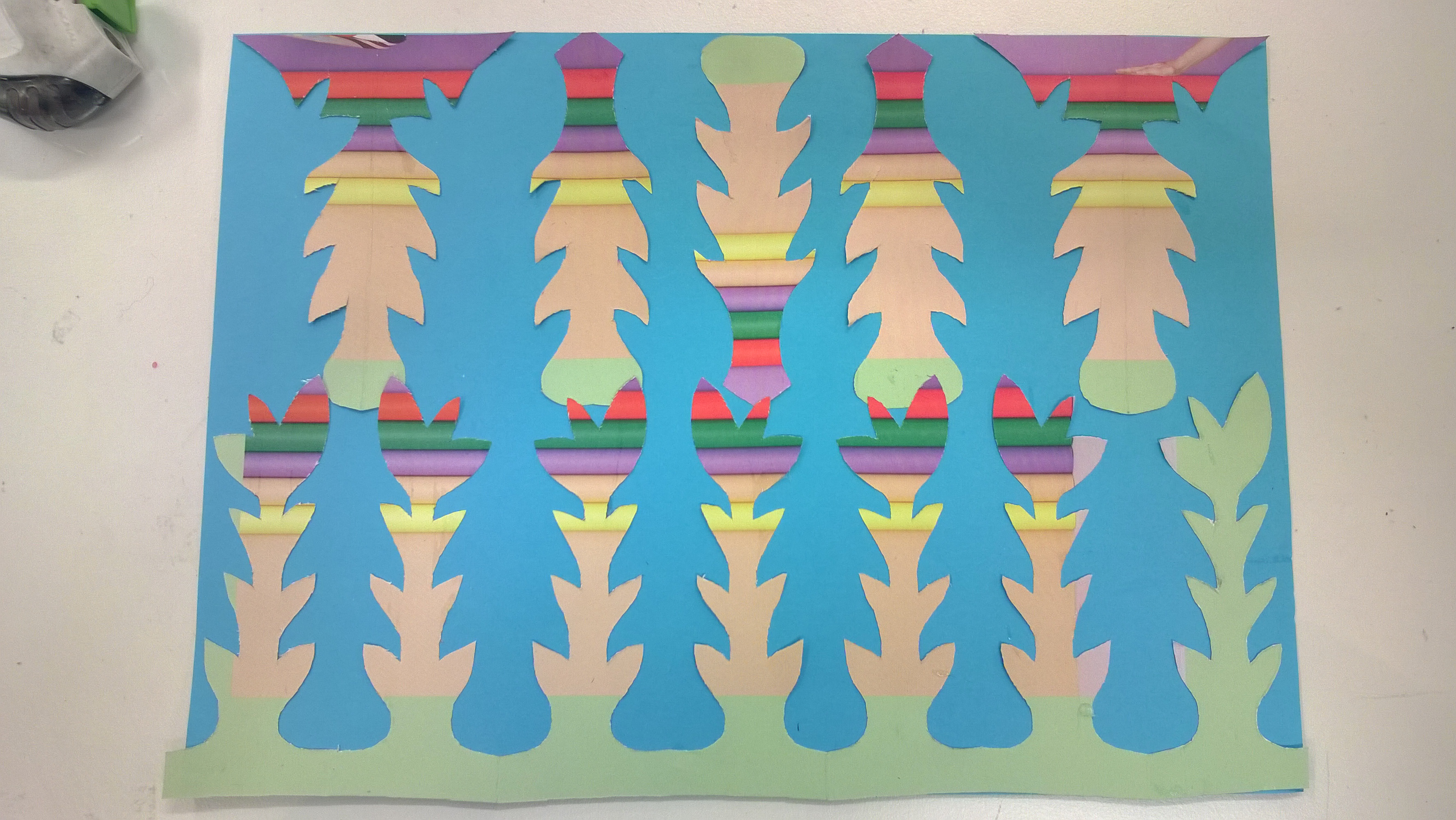 Sommittelutehtävässä saimme tehtäväksi piirtää ulkoa löytämämme kasvin tai jonkun muun “kappaleen”. Tehtävä oli ensin yksinkertaistaa kuva ja sitten leikata kahdesta eri värisestä paperista se sekä uudelleen sommitella. Tällaisia vaiheita tuli omasta mielikuvituskasvistani.